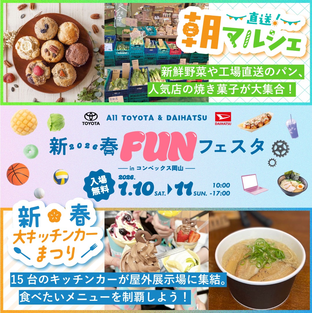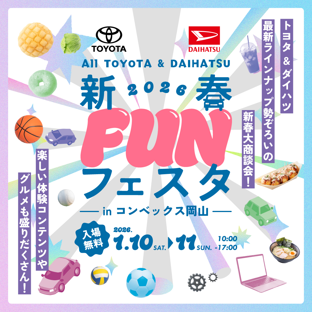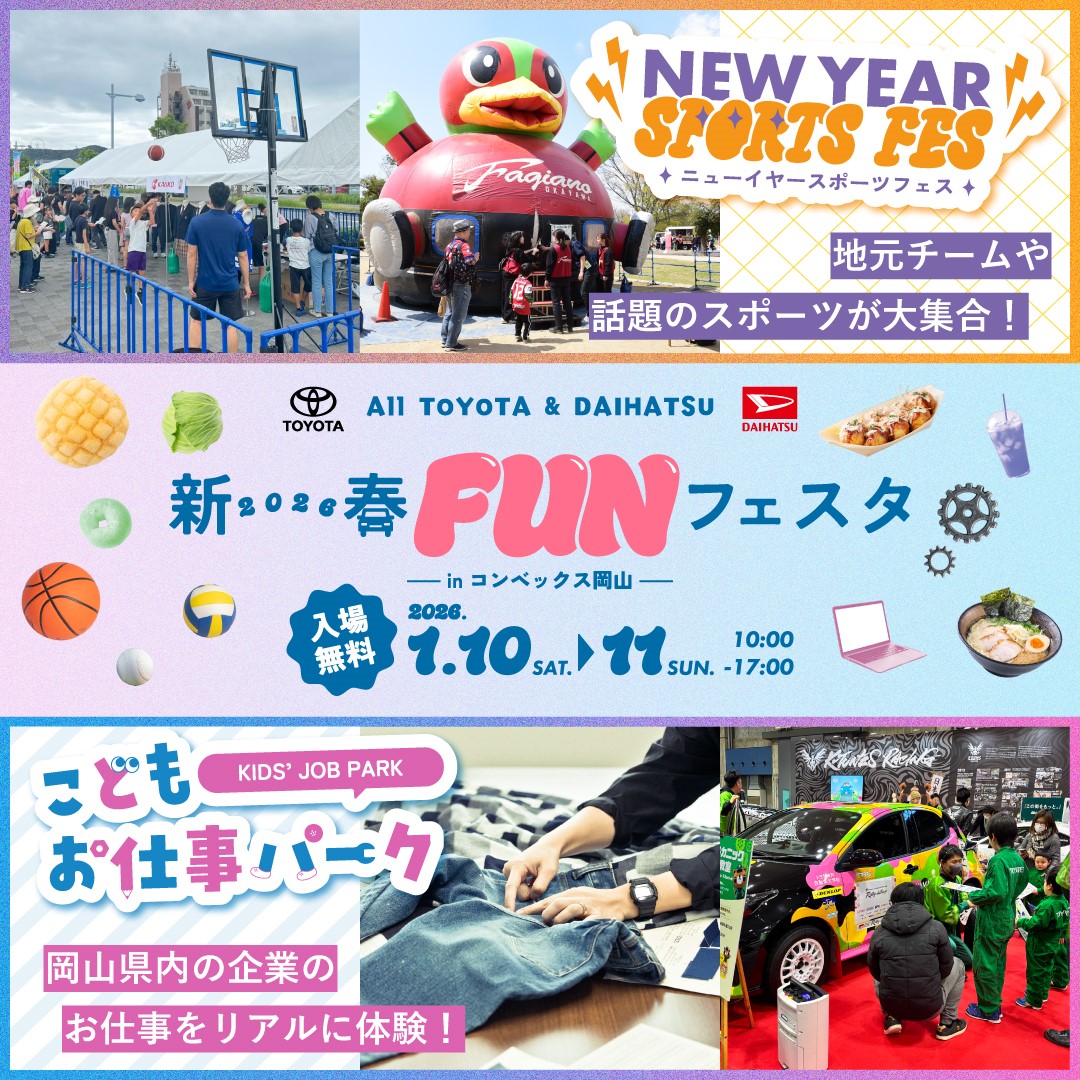 新年明けましておめでとうございます!本年も備前発条株式会社を宜しくお願いいたします!1/10、1/11の2日間、 コンベックス岡山に於いて開催されます「オールトヨタ・ダイハツ 新春FUNフェスタ」イベントに両日、ブース出展させて頂きます!お仕事体験ブースにて身近な物を使って、走るペーパークラフト作りを行います。車はどうやって動いているのか?なんでタイヤはゴムなの?といった車の仕組みを工作しながら考えていきます!他にも様々なブースや美味しいグルメも出展されておりますので、ご家族・ご友人お誘いの上お越しください!2日間、弊社スタッフもイベントを盛り上げて参りますのでブースへお立ち寄り頂けますと幸いで御座います!何卒、よろしくお願い申し上げます!